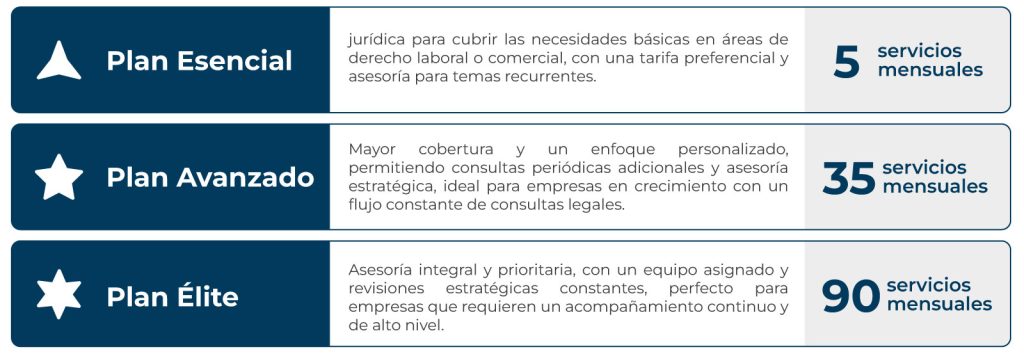 Le brindamos a tu empresa una asesoría legal permanente en la que contarás con un equipo de más de 50 abogados expertos en diferentes áreas para hacer frente a todas tus necesidades legales, sin límite de consultas.